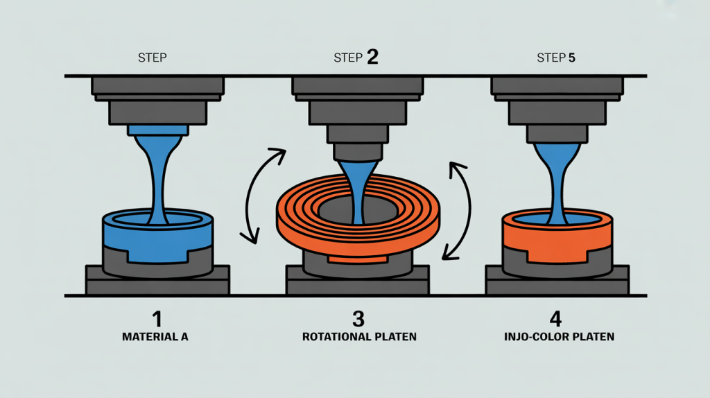 The most common type of dual material tooling uses a rotational platen. The process is a marvel of efficiency, producing a finished, two-material part with every cycle. Here’s a step-by-step breakdown of how it works.